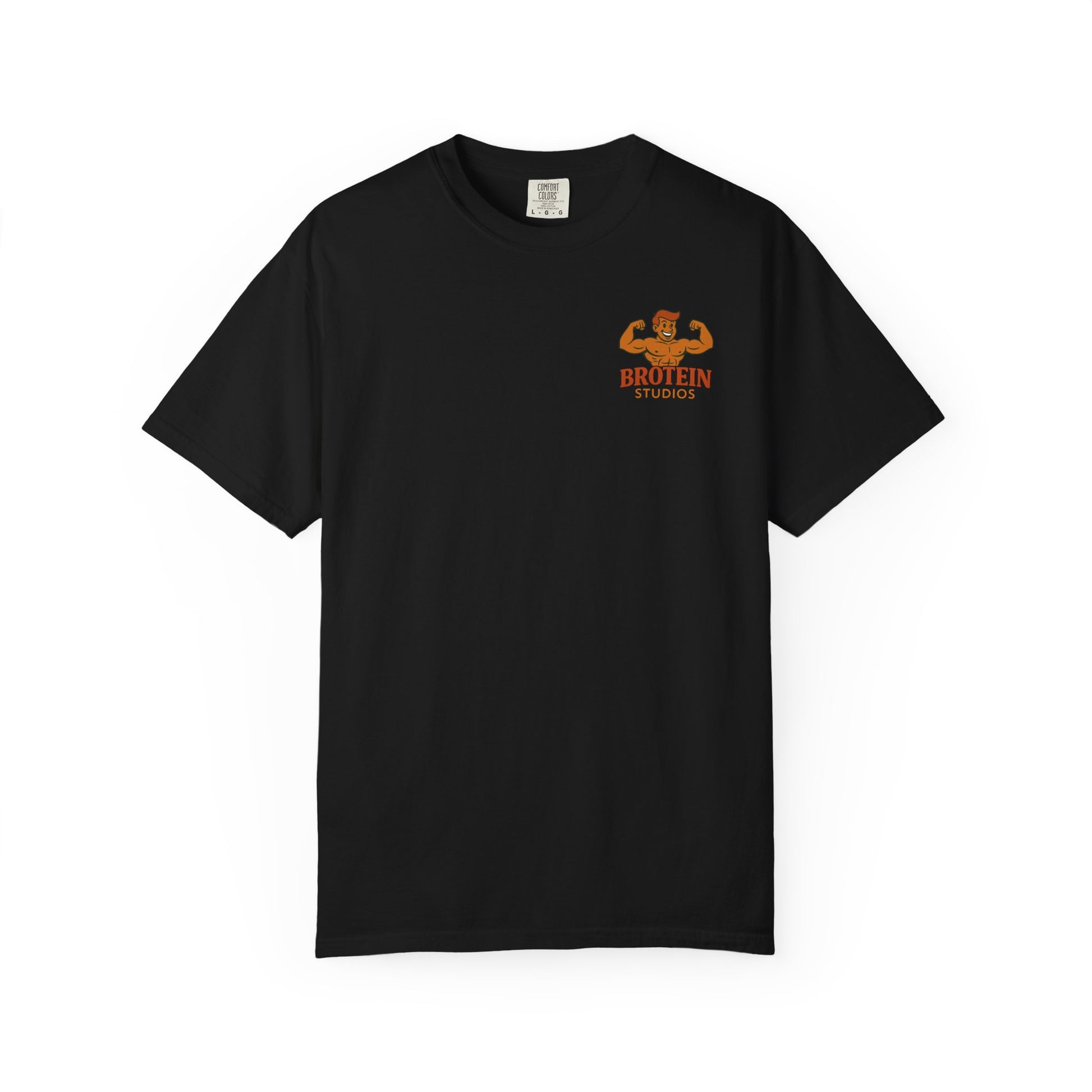 This shirt features the Brotein Studios icon himself—massive lats, minimal luggage. Whether you're spreading wings in the gym or just out here living light, this tee says it all without saying a word.